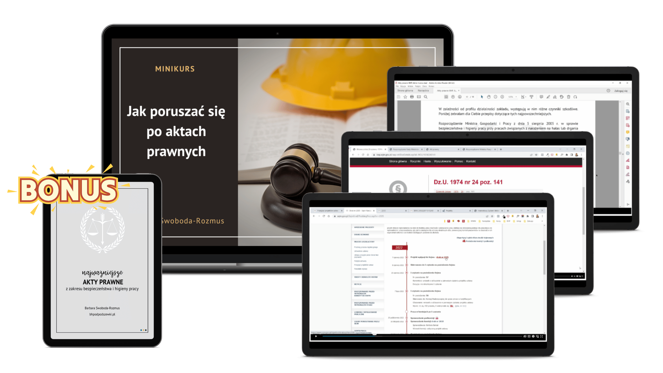 W kursie otrzymasz w nim PDF z linkami do najważniejszych aktów prawnych. Nie otrzymasz więc treści aktów, ale linki, po kliknięciu których zostaniesz przeniesiona lub przeniesiony do treści przepisów. Okresowo weryfikuję status prawny tych linków i jeśli coś się zmieni, aktualizuję.